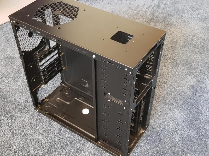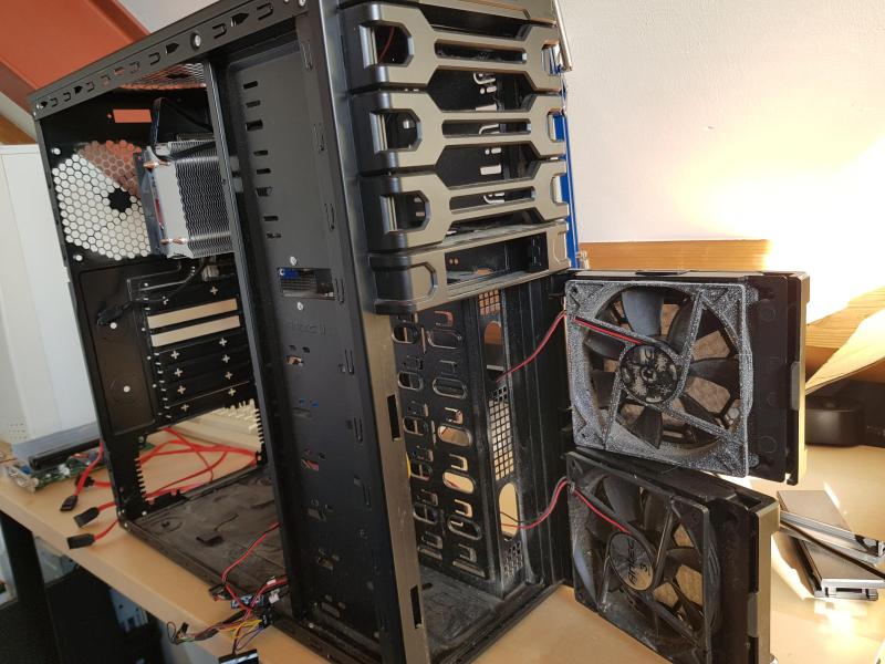 Zo. alles is er uit. Alle componenten alsook de 5.25" en 3.5" afdekplaten aan de voorzijde. Kijk ook even naar de vieze fans aan de voorzijde. Die bovenste ziet wit van de ?? Schimmel? Het is hard, en zit behoorlijk vast. Stinkt ook. |