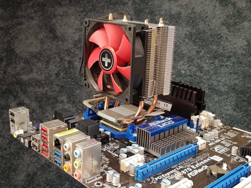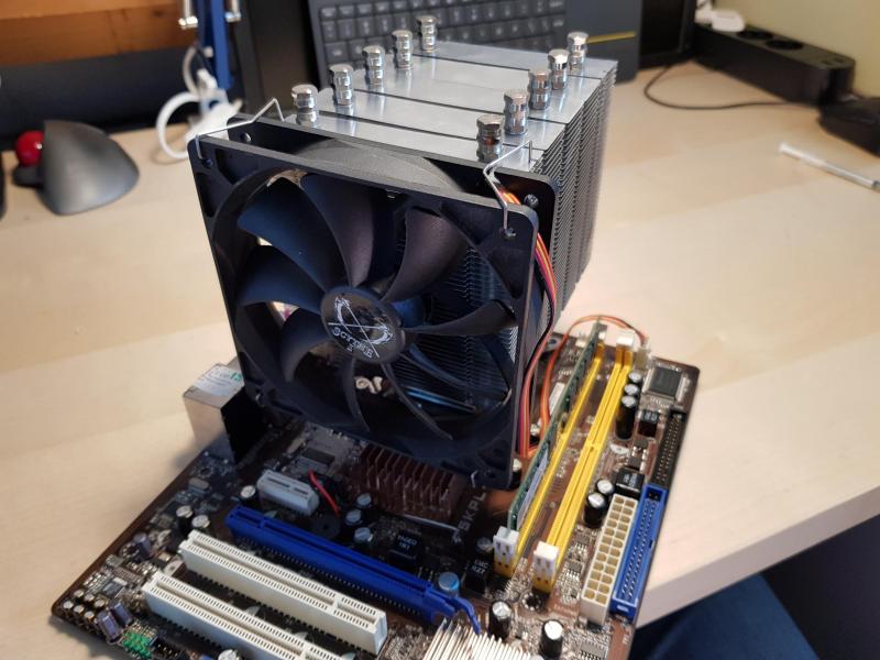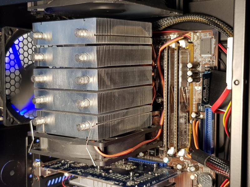 Dit is de koeler die er nu op zit. Mijn Skythe Mugen II, die van mijn i7 systeem afkomt. Die had ik nog apart liggen. Ik heb de koeler verticaal geplaatst, en de fan aan de onderzijde gemonteerd. Zo houdt ik de RAM-banken bereikbaar, en geeft het ook een mooiere airflow door de koeler aangezien hij nogal dicht op de bovenste chassisfan zit. |