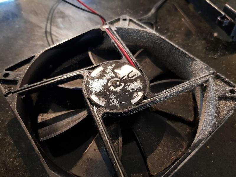 Dan is het de beurt aan de fans. De kast heeft er 4. 3x 120mm, en 1x 140mm. Deze op de foto is de bovenste van het front, die witte aanslag gaat er af, zij het wel moeizaam... |