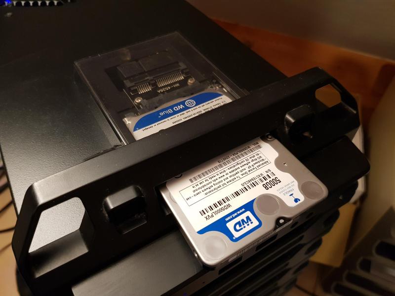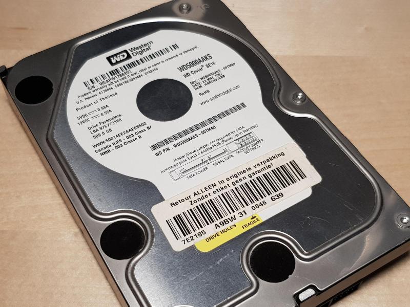 De kast wordt weer geassembleerd, en dit zijn de harde schijven die er in komen. Een WD 5000AAKS, 500GB voor de opslag. |
